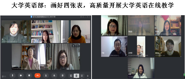 大学英语部承担着全校2018级、2019级6000多名学生的大学英语教学。根据四虎 新冠肺炎疫情防控工作要求,结合教务处本科教学安排,从2月初开始积极筹备大学英语在线教学,努力画好“四张表”,做好四个方面工作:一是抓协调组织,画好责任分工表,成立教学副院长、大外部主任、副主任、课程组长为成员的在线教学筹备工作小组,多次召开视频研讨,确保四虎 决策部署第一时间学习传达,并按照“线下学习,线上互动,平台展示”教学理念,合理制定网上教学实施方案和管理方案;二是抓学生排摸,画好班级选课表,利用微信、QQ、钉钉等新媒体工具,建立学生选课情况名单信息库,任课教师向每位学生调查了解在线教学需求和学习保障需求,对在线教学困难学生给予指导帮助;三是抓课程质量,画好教学模块表,大学英语课程分3个层次,4个模块课程教学,各课程组分头召开视频会议,进行网上教学研讨,统一规划学习内容,设计开发网上学习资源,保证学习资源质量。四是抓模拟演练,画好平台操作表,各课程组提前一周分头组织师生利用钉钉、QQ直播等平台开展网上教学测试工作,编印师生在线学习注意事项小指南,明确大学英语在线教学精准安排,不断提高师生在线教学的主动性和自觉性,确保高质量开展大学英语在线教学。