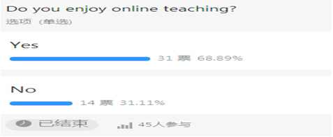 从投票结果发现,喜欢网络教学的学生占比接近70%,该比例与教务处所统计的“浙江科技四虎 网络教学质量日报”中的比例惊人相似。看到这个数据顺便可以进行现场教学,如何用英语描述统计结果。