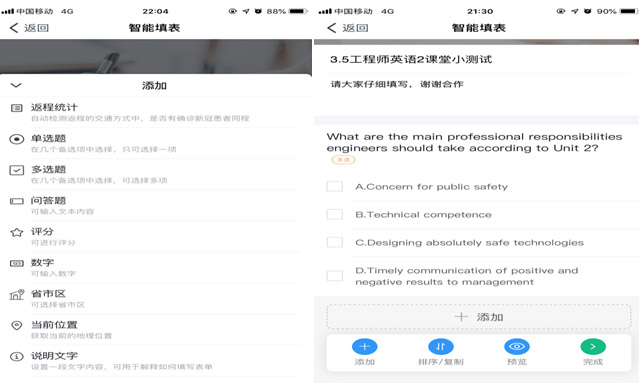 钉钉的“智能填表”具有“多选题”的功能,教师可以设计一些问题,随时了解学生对自身教学的情况,及时反思、改进。