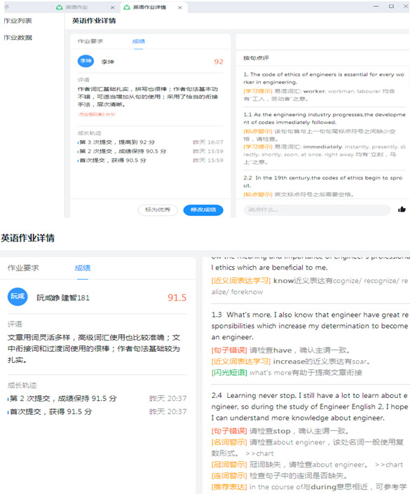 该板块具有“按句点评”“评语”“打分”“成长轨迹”等四项功能,按句点评时系统会给予以下点评:学习提示、标点警示、近义词表达学习、句子错误、闪光短语、推荐表达、以及各类词性的警示,如名词警示、冠词警示,等等。