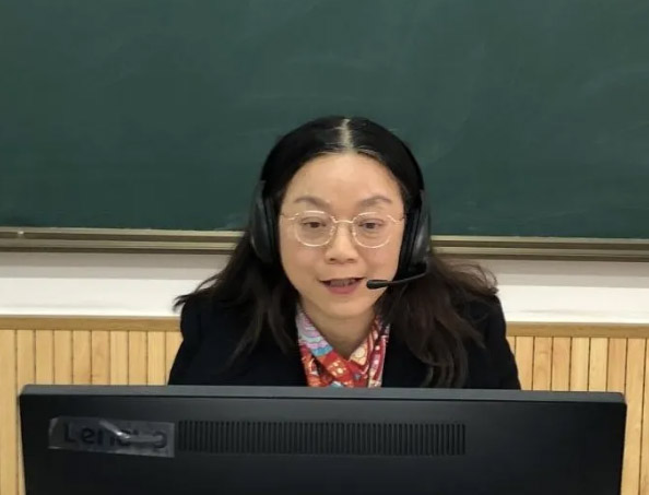 随后朱吉梅教授开始讲座,分别从现实背景、理论基础和实践操作三个方面层层递进,梳理了疫情期间上级教育主管部门和四虎 发布的一系列文件,指出在当前疫情突发且持续的背景下,采用线上教学方式是实现“停课不停教”的必然选择。同时引用多篇文献介绍互动教学的理论基础、方案和方法。朱老师认为基于互动教学理论的钉钉教学平台能够帮助教师及时掌握学生课堂表现,提高教学互动的有效性,随即向大家实际演练了如何在钉钉平台操作实现教学目标,教学中还选取了疫情防控期间的优秀人物事迹融入课堂教学,实现课堂思政与专业教学的有机融合。