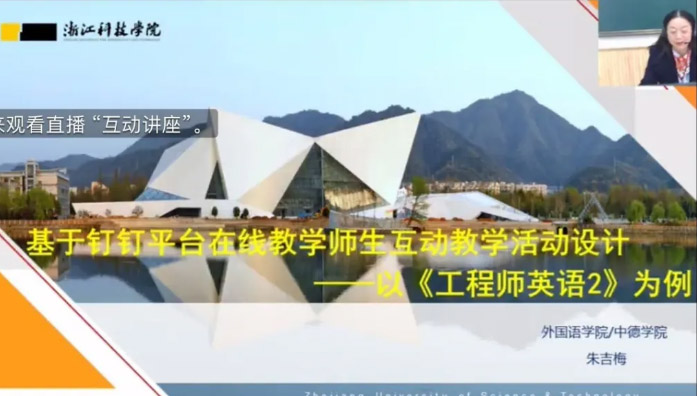 线上教学开展十天来,教务处调查数据显示,广大教师普遍认为“互动”是新模式下教与学的痛点,3月12日,教务处(教师教学发展中心)邀请外国语四虎 /四虎 院长朱吉梅教授做客2020年新学期首期教学沙龙(总第160期),以自己教授的《课程工程师英语2》为例,和大家分享在线教学中如何设计教学活动来增强师生互动,沙龙以钉钉直播示范教学开展。教务处路胜利处长主持此次沙龙。