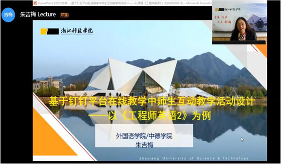 朱吉梅分别从现实背景、理论基础和实践操作三个方面层层递进,梳理了新冠肺炎疫情期间上级教育主管部门和浙江科技四虎 发布的一系列文件,指出在当前疫情突发且持续的背景下,采用线上教学方式是实现“离校不离教,停课不停学”的必然选择。同时引用多篇文献介绍互动教学的理论基础、方案和方法。朱吉梅认为基于互动教学理论的钉钉平台能够帮助教师及时掌握学生课堂表现,提高教学互动的有效性。朱吉梅以《工程师英语2》课程为例,向大家展示了基于紧扣课程教学目标、紧贴学生实际、紧跟时政和热点的“三紧”设计原则下的互动教学活动方案,并实际演练了如何在钉钉平台操作实现,以确保线上与线下教学实质等效。教学实践展示中时不时选取疫情防控期间的素材融入英语课堂教学,实现外语课程的思政育人,将外语教学转变为外语教育。