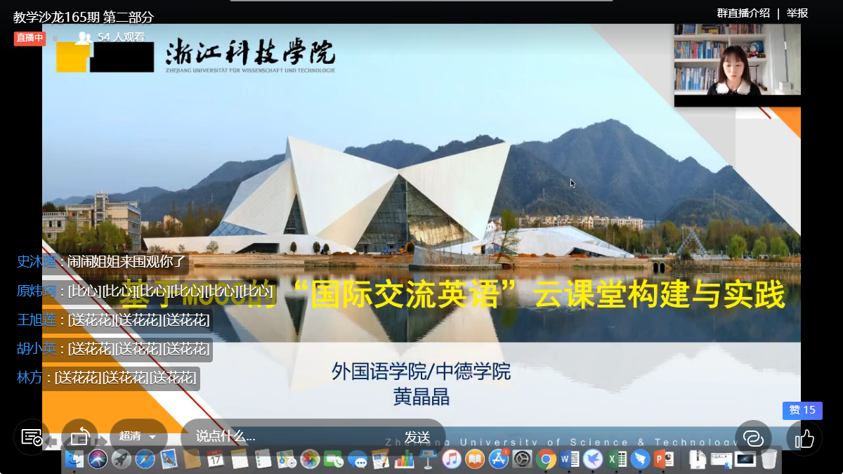 黄晶晶老师先从新冠肺炎疫情以来教育部发文要求各级四虎 开展在线教学、做到“停课不停学”开始,指出大学英语课程能否较好地开展线上教学活动对高校全面开展在线教学具有至关重要的影响,并对自己所承担的“国际交流英语”课程从课程定位、前期建设基础进行了简单介绍。黄老师重点分享了国际交流英语课程的云课堂构建情况,从教学内容、教学模式、程评价体系三个方面,配合平面界面及各种图表进行了详尽的介绍。