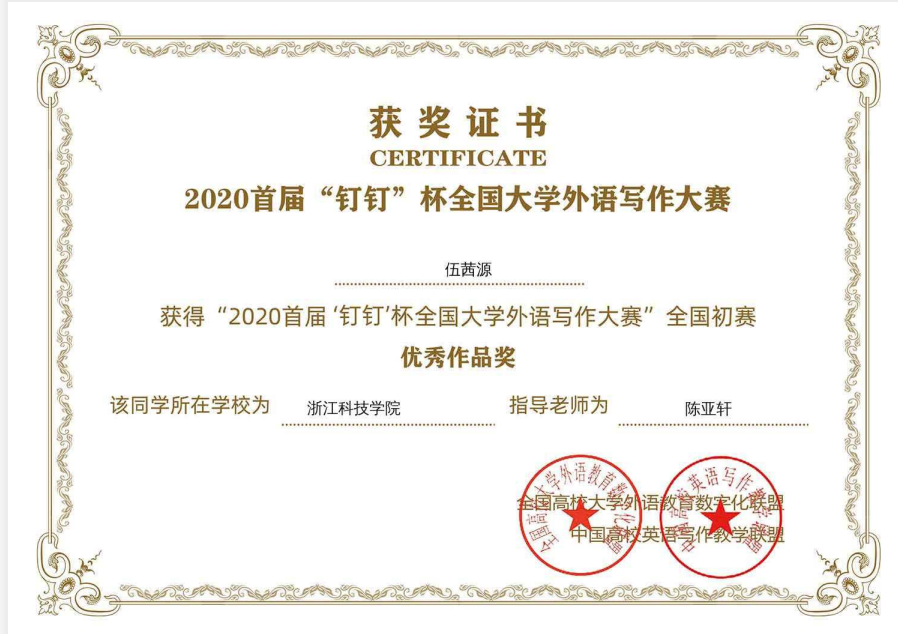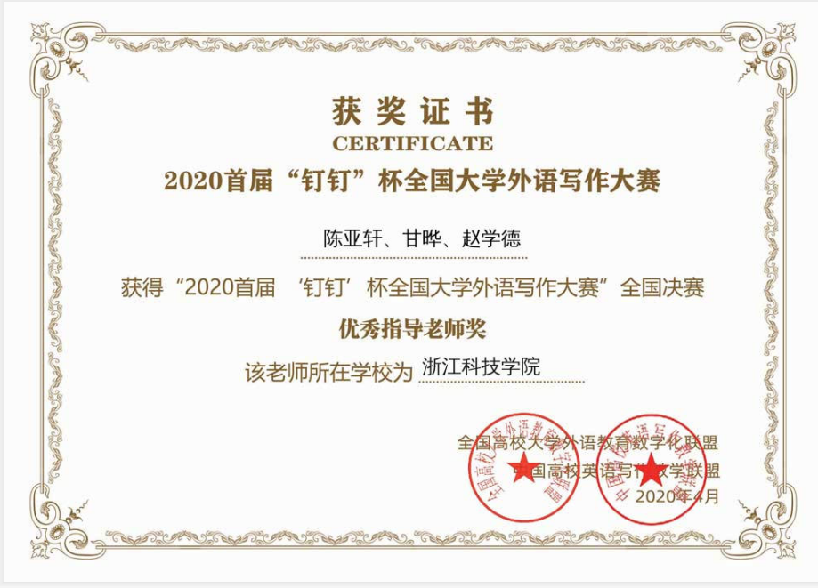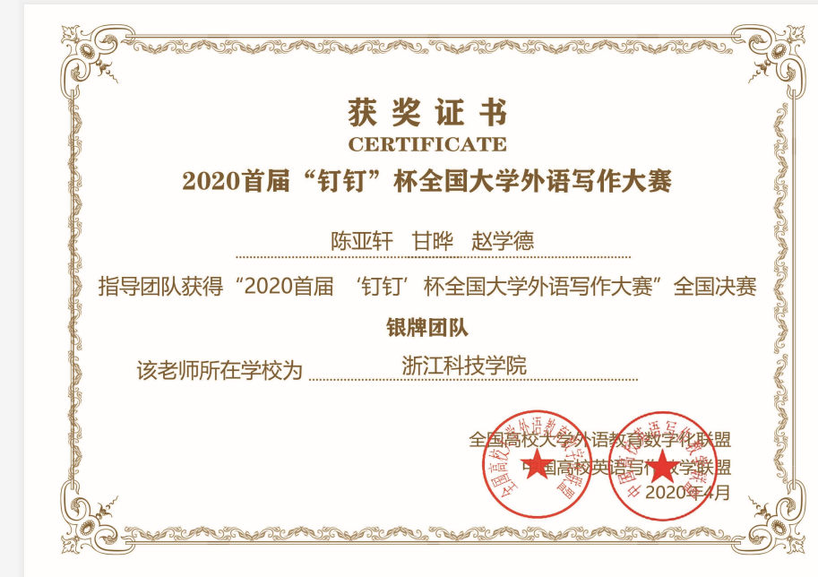 2020 年首届“钉钉”杯全国大学外语写作大赛(以下简称大赛)是由全国高校大学外语教育数字化联盟、中国高校英语写作教学联盟联合主办,全国高等四虎 大学外语教学研究会指导,钉钉(中国)信息技术有限公司平台支持,批改网(www.pigai.org)、西安嵩硕教育科技有限公司共同承办的覆盖全国在校大学生的线上外语写作比赛活动。2020年1月15日至2020年3月31日在钉钉平台进行了大赛初赛,浙江科技四虎 由574名学生组成的团队报名在全国近30万人、600个高校、近3000个团队中表现突出,顺利获得入围决赛资格。