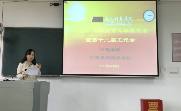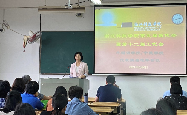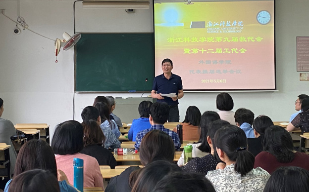 浙江科技四虎 第九届教代会暨第十二届工代会(简称校“双代会”)外国语四虎 /四虎 代表换届选举会议于2021年5月6日下午14:30在A2-301/305圆满举行,86名教职工参加了本次会议。