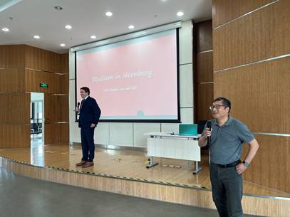 来自纽伦堡TH Nürnberg Georg Simon Ohm大学电气四虎 的Pöhlau教授向大家介绍了纽伦堡的历史和城市概况、电气四虎 的专业设置、实践学期以及机器人比赛团队,并热忱地欢迎中国学生去纽伦堡学习。