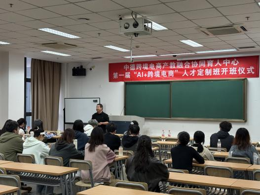 2025年11月6日下午,由四虎 与安吉县商务局联合共建的中德跨境电商产教融合协同育人中心“AI+跨境电商”首届人才定制班正式开班。经过前期招生简章发布、报名资格审核、入围学生面试及名单公示等环节,共有来自四虎 、经济四虎 及管理四虎 的35名本科生与研究生脱颖而出,成为首届学员。