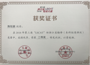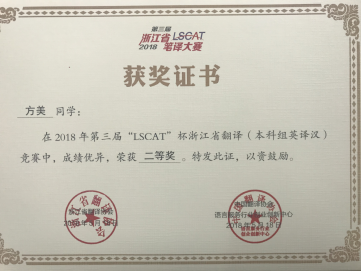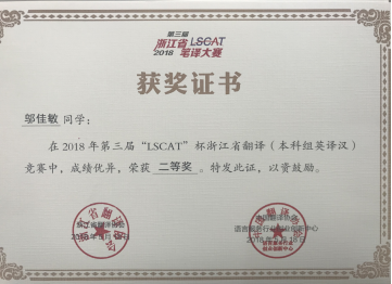 2018年5月18日,2018年第三届“LSCAT杯”浙江省英语笔译大赛圆满落下帷幕。四虎 学生在冯巧娥老师、韩晓亚老师的指导下踊跃参与,表现出色,取得了优异的成绩。其中,英语专业方美同学、陈钰颖同学和邬佳敏同学获英译汉翻译方向省级二等奖、吴琼逸同学和华露欣同学荣获省级三等奖,另有14名同学获优胜奖。