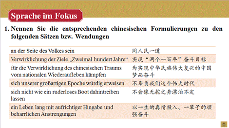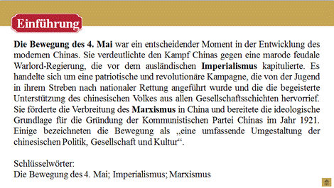 学生在阅读和讲解的过程中,内化文章内容与表达手段,能作口头报告; 掌握与五四精神、青年与责任相关的重要表达与固定搭配;能用德语介绍五四运动与五四精神及其蕴含的全球意义。