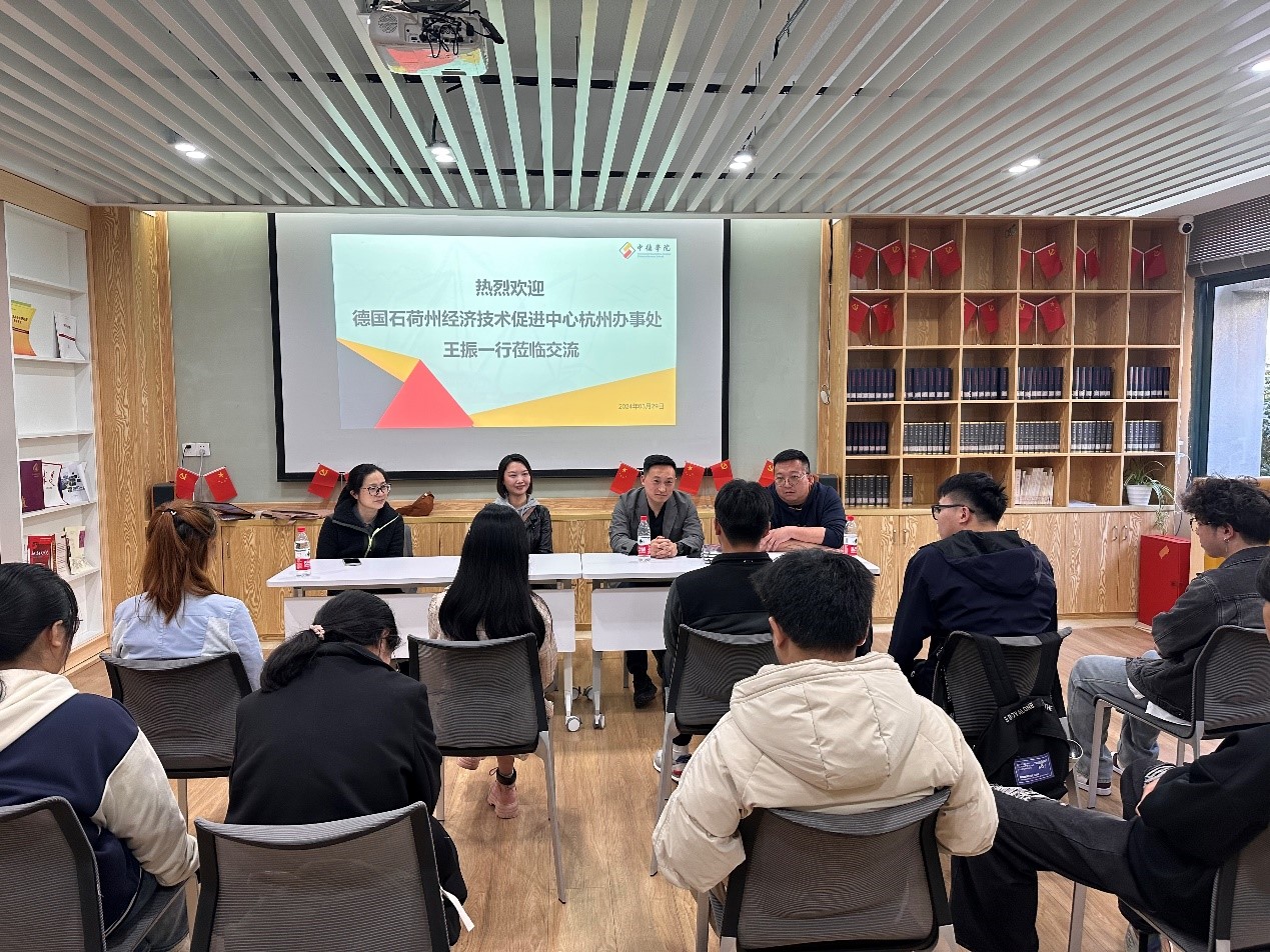 2024年3月29日德国石荷州经济技术促进中心杭州办事处副主任王振一行到访四虎 ,他们与德语专业大三学生介绍了办事处概况,并为学生未来的就业提供了宝贵意见。四虎 党委副书记茹潇潇参与本次交流会。