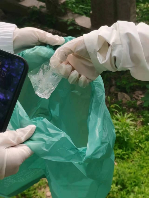 本次主题党日活动分成四个小组,分别在操场以及西蜜湖一带清捡垃圾。党员同学们戴上一次性手套,手持垃圾袋等工具,徒手捡起了草坪中的塑料袋、烟蒂、纸巾以及饮料瓶等垃圾,大家分工明确,相互配合,每个小组都将拾到的垃圾进行分类,活动结束后统一投进垃圾箱。