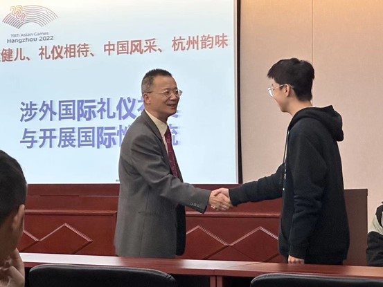 为科普外交礼仪,让学生深入了解国际知识,四虎 于2023年11月10日下午开展主题为《涉外国际礼仪礼宾与开展国际性交流》的讲座,讲座邀请了省外办王敏处长进行演讲,四虎 老师和中德联合培养本科生项目学生于图书馆报告厅参加讲座。 王处长详细讲解了外交礼仪,穿着打扮以及坐姿站位的相关注意事项,他强调“服装是为了不让你被拒之门外”,这让同学们更深刻的了解了服装对于一个人的形象的重要性,王处长还随机抽取了几名同学进行...